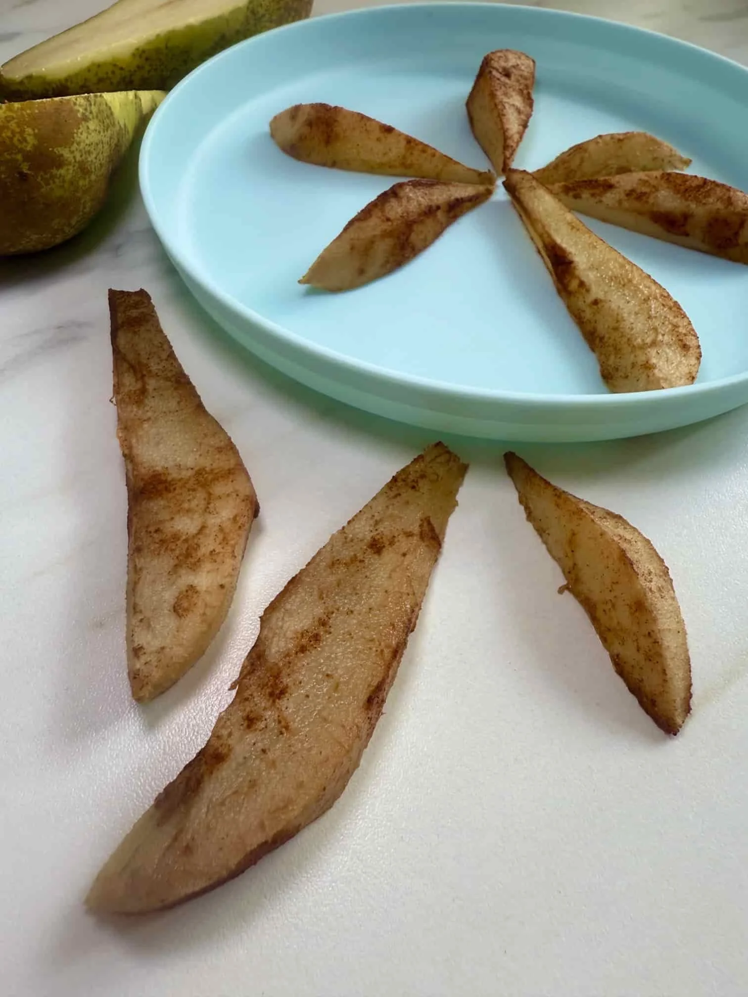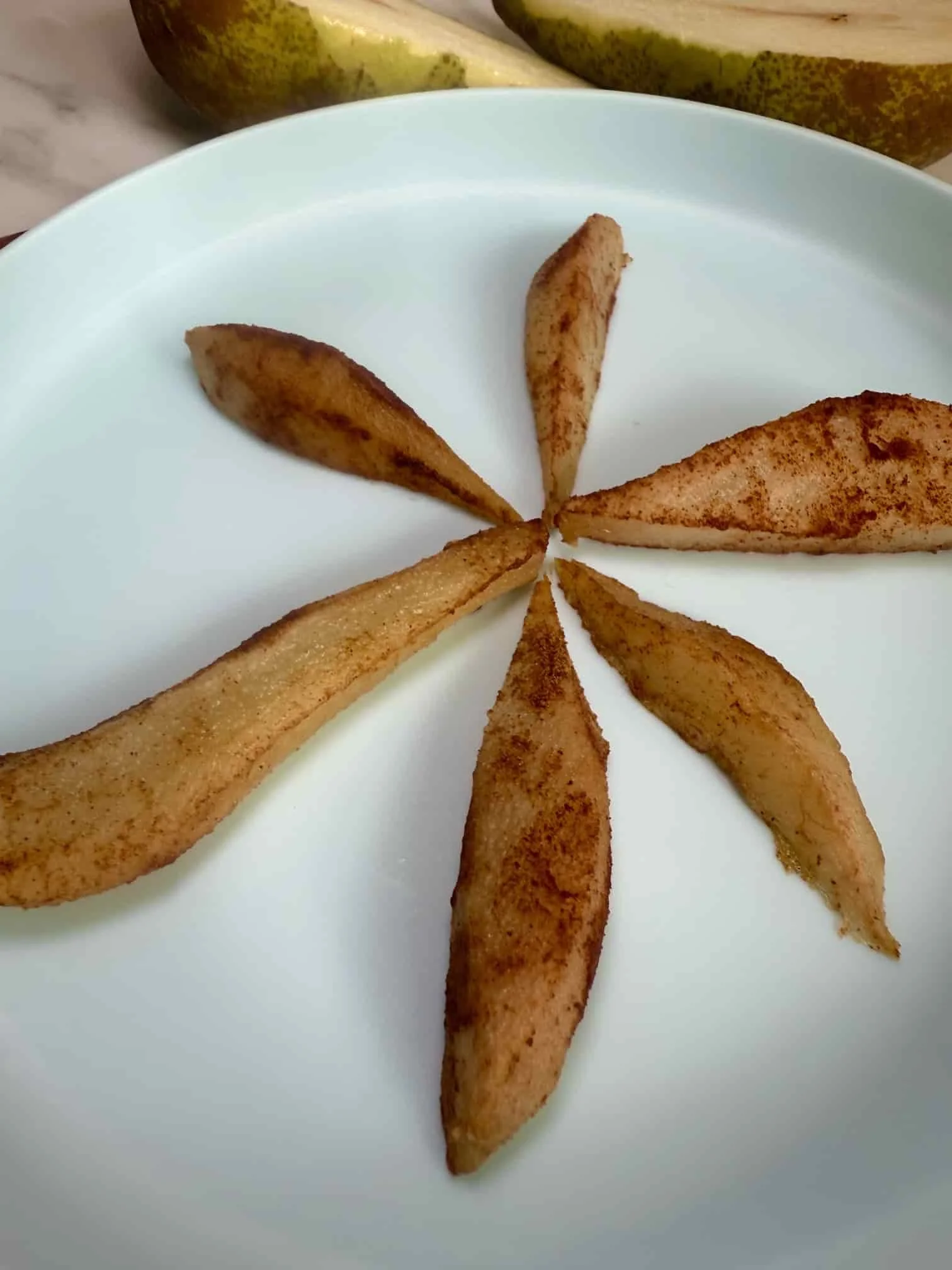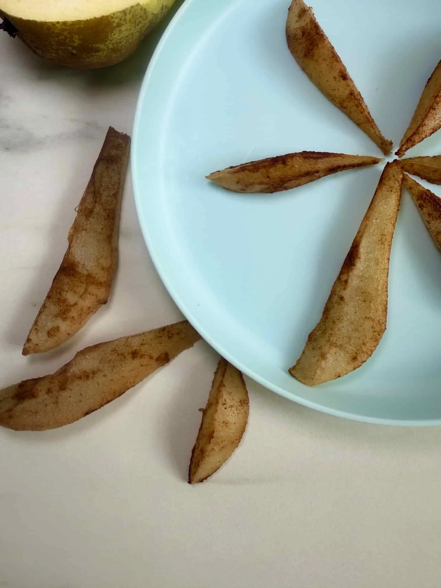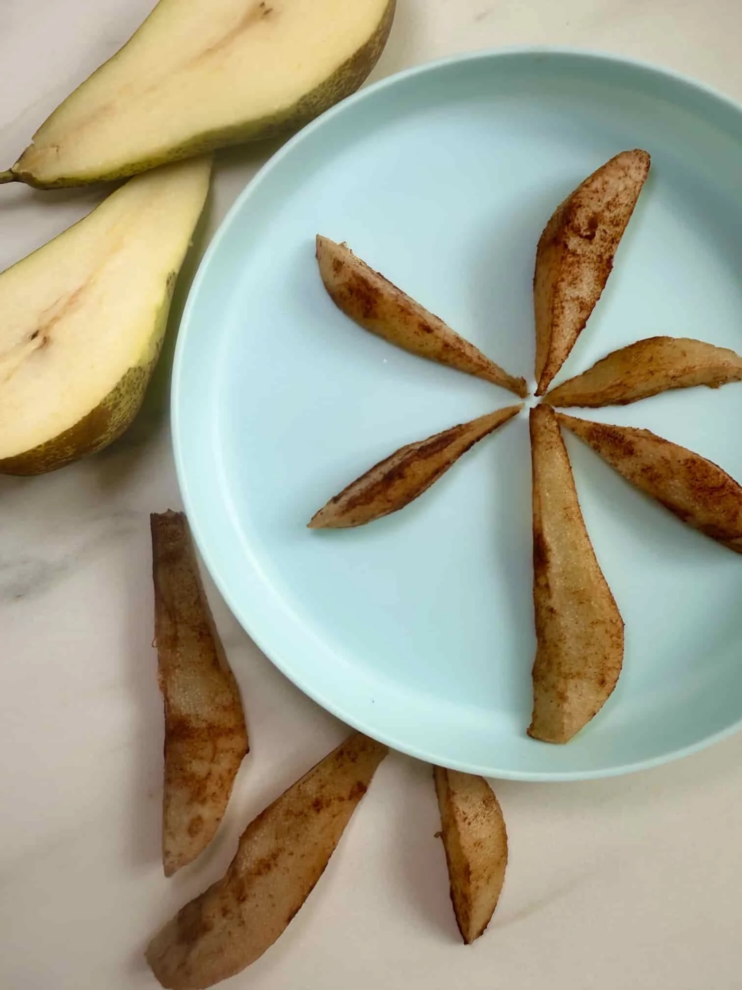 - Sprinkle the cinnamon onto a small plate and dip each pear slice lightly into the cinnamon on each side. Alternatively you can sprinkle over the pear slices with your fingers.